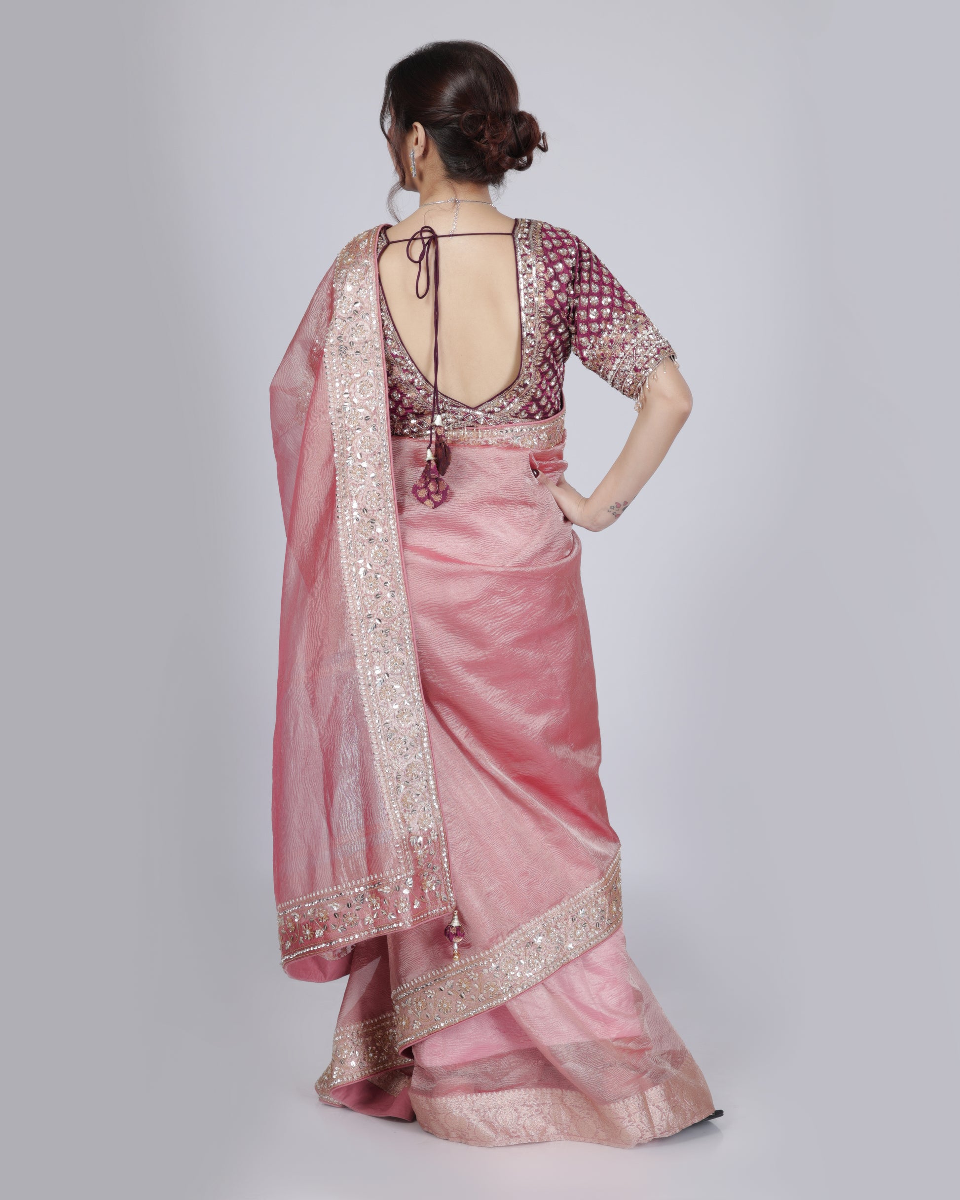 Turn heads at any occasion with this exquisite designer saree in a soft blush pink shade. Crafted from premium fabric for a graceful drape, the saree is highlighted by a shimmering embellished border that adds a touch of luxury and festive charm. The contrasting deep wine-colored blouse features intricate mirror work and delicate embroidery, making it a true statement piece. This elegant ensemble is perfect for weddings, receptions, festive celebrations, or any special evening where you want to shine with sophistication.