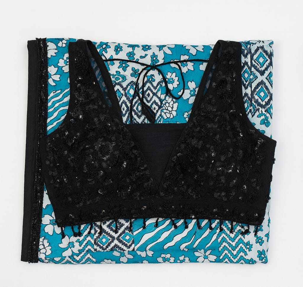 This printed saree and embellished blouse set is a statement blend of tradition and modernity. Crafted in a lightweight, comfortable fabric, the saree features intricate floral and geometric prints for a stunning visual appeal. The sequin-detailed blouse with a tie-back design adds a festive charm that makes it perfect for special occasions, parties, or cultural events.