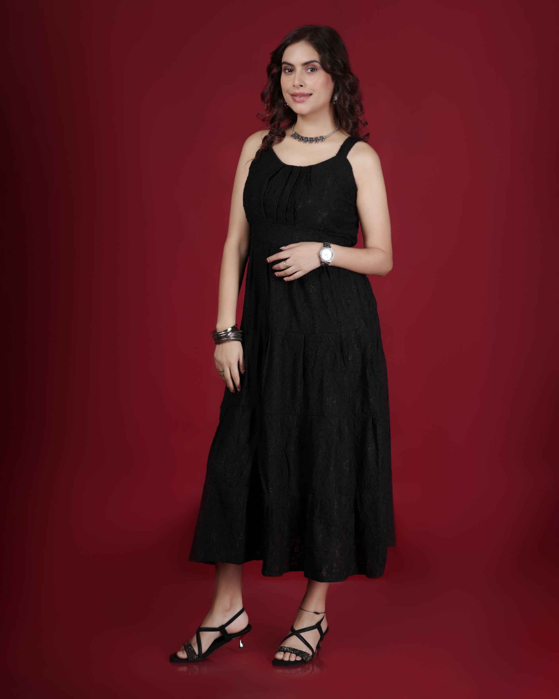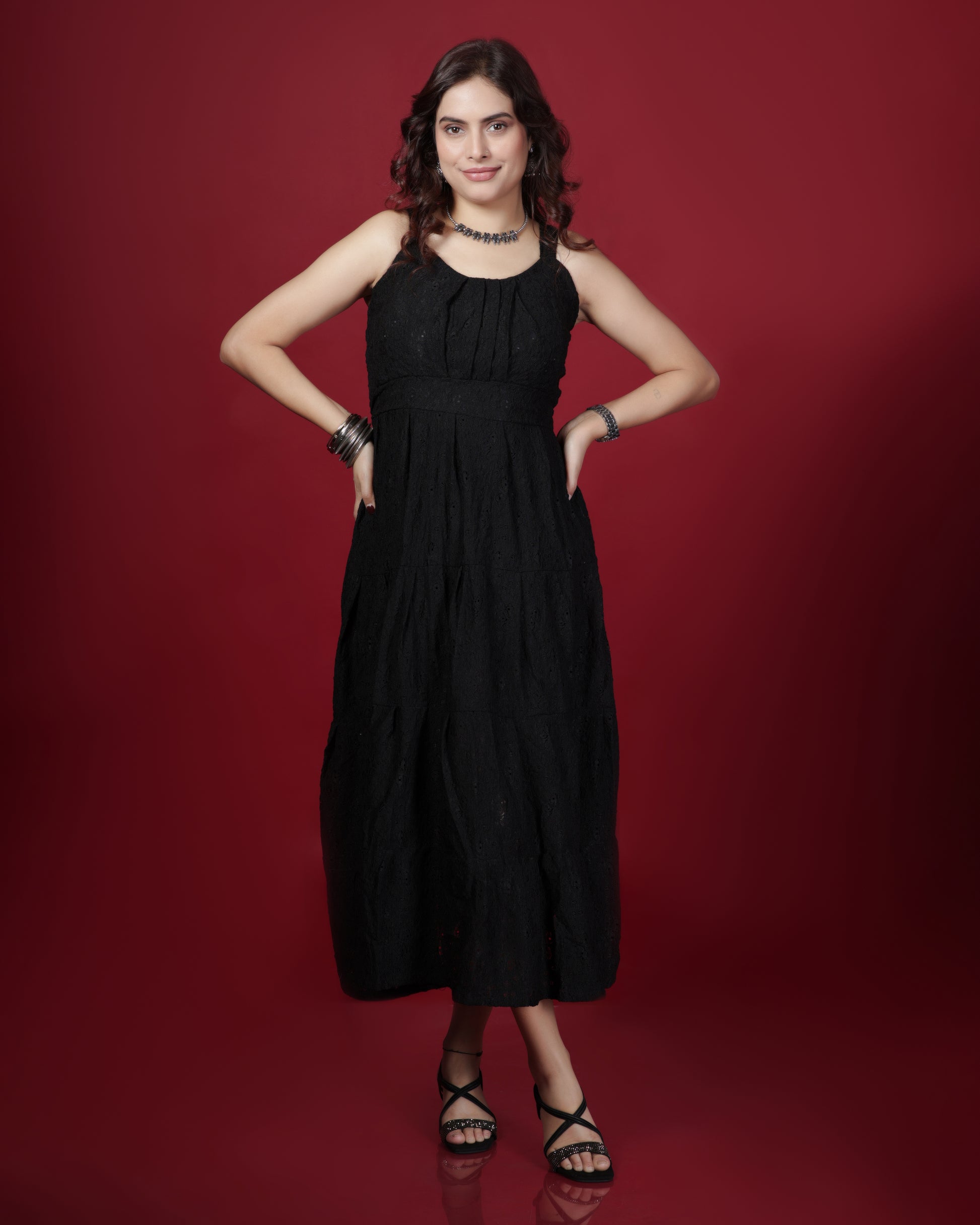 Step into effortless elegance with this classic black midi dress, crafted for both style and comfort. The sleeveless design and fitted waistline create a flattering silhouette, while the flowy tiered skirt adds a touch of grace and movement. Perfect for dinners, parties, or casual evening outings, this versatile dress brings a blend of charm and sophistication to your wardrobe.